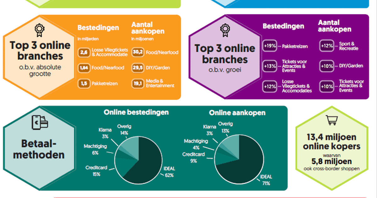Het aantal aankopen dat via de smartphone is gedaan blijft stijgen, van 33% in het eerste half jaar van 2022 naar 35% in het eerste half jaar van 2023. Dit gaat ten koste van het aantal aankopen dat gedaan wordt via de tablet (van 13% naar 12%) en desktop/laptop (van 52% naar 51%). iDEAL groeit in online bestedingen (van 61% naar 62%) en aantal online aankopen (van 70% naar 71%). Het gebruik van de creditcard stijgt in zowel bestedingen (van 14% naar 15%) en aankopen (van 8% naar 9%), met name door cross-border aankopen. Ook het aandeel van Klarna groeit verder door: het aandeel in de online aankopen is gestegen van 2% naar 3%.