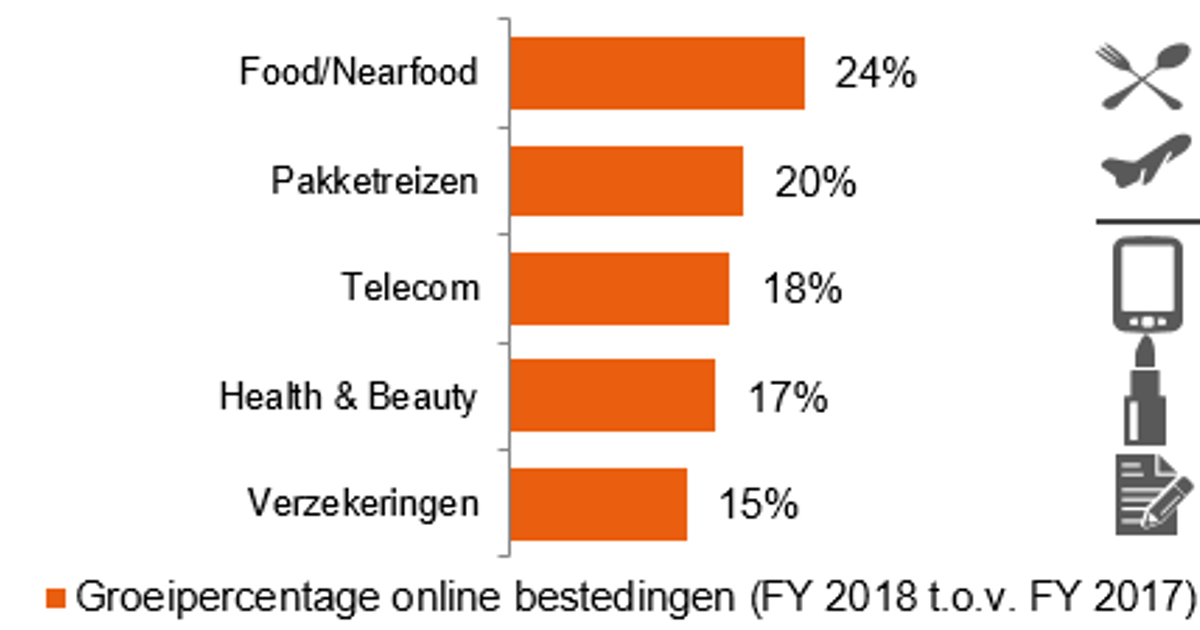 Als we kijken naar de verschillende productcategorieën, zien we een stijging van 24% in de online aankopen binnen Food/Nearfood, wat deze categorie de sterkste stijger van 2018 maakt.* Vergeleken met een jaar eerder (+35%), vlakt de groei van de online bestedingen binnen dit segment wel wat af, maar daartegenover staat dat het aantal online aankopen binnen Food/Nearfood wel harder stijgen dan in 2017 (van 25% naar 31%).