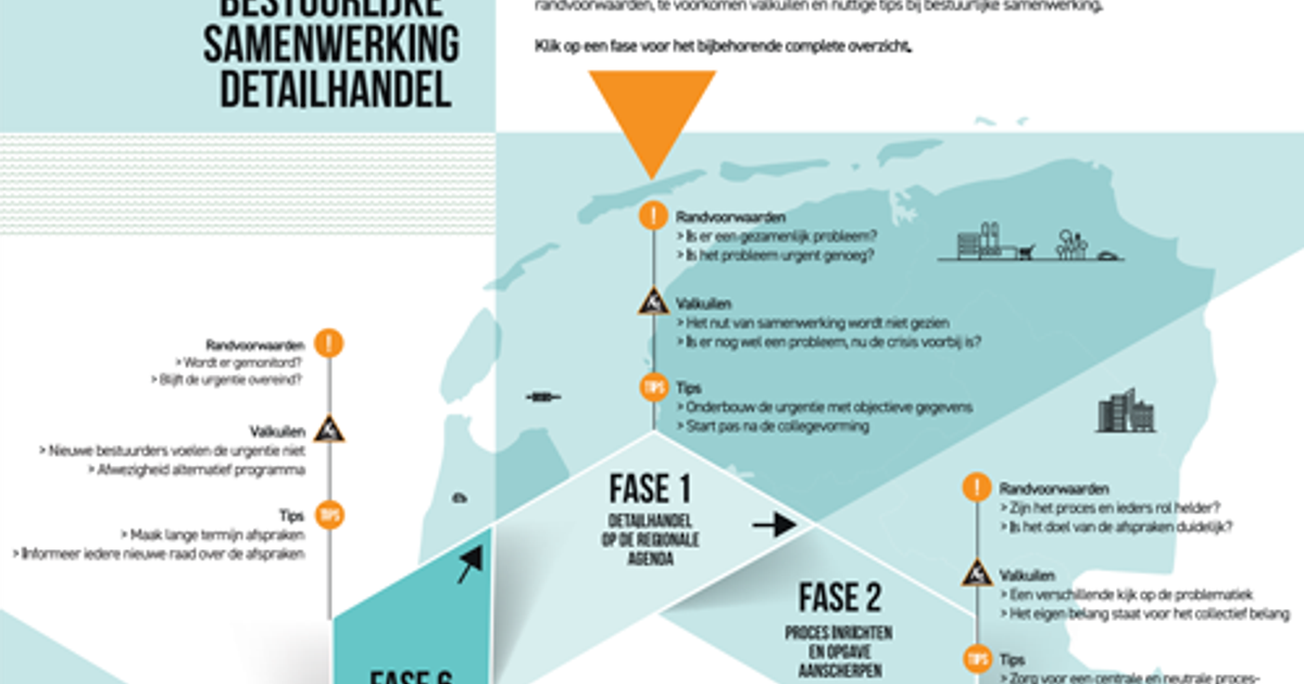 De consument die wil winkelen, houdt geen rekening met de grenzen van gemeenten of provincies. Daarom is het van belang dat op regionaal niveau afstemming plaatsvindt over toekomstbestendig detailhandelsbeleid. De routekaart ‘Bestuurlijke samenwerking detailhandel’ beschrijft de zes fases om te komen tot bestuurlijke regionale samenwerking, inclusief per fase alle randvoorwaarden, valkuilen en nuttige tips . Het stappenplan is tot stand gekomen aan de hand van interviews en een intervisiesessie met regio’s die al ervaring hebben met bestuurlijke regionale samenwerking op het gebied van detailhandel. Aan het traject is deelgenomen door Parkstad Limburg, regio IJmond, regio Oost-Groningen, Leidse regio, de Metropoolregio Eindhoven (MRE) en A12 Corridor. Dit heeft geleid tot interessante inzichten en learnings die ook in andere regio’s toepasbaar zijn. Deze zijn in opdracht van de Retailagenda en provincies door Stec Groep deze in kaart gebracht en beschreven.